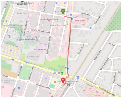 Um aus Berlin zum StudiogeläStudiogelände zu gelangen, nehmen Sie die Autobahn A115 („Avus“„Avus“) bis zur Abfahrt Potsdam-Babelsberg. Folgen Sie dann der NuthestraßNuthestraße Richtung Zentrum bis Abfahrt Wetzlarer StraßStraße (Medienstadt Babelsberg), dort rechts am BMW Autohaus vorbei und dann links Richtung Babelsberg. Kommende Kreuzung GroßbeerenstraßGroßbeerenstraße/Wetzlarer StraßStraße üüberqueren in die August-Bebel-StraßStraße. Nach weiteren 500 Meter sehen Sie auf der linken Seite den Haupteingang zum Studio Babelsberg.